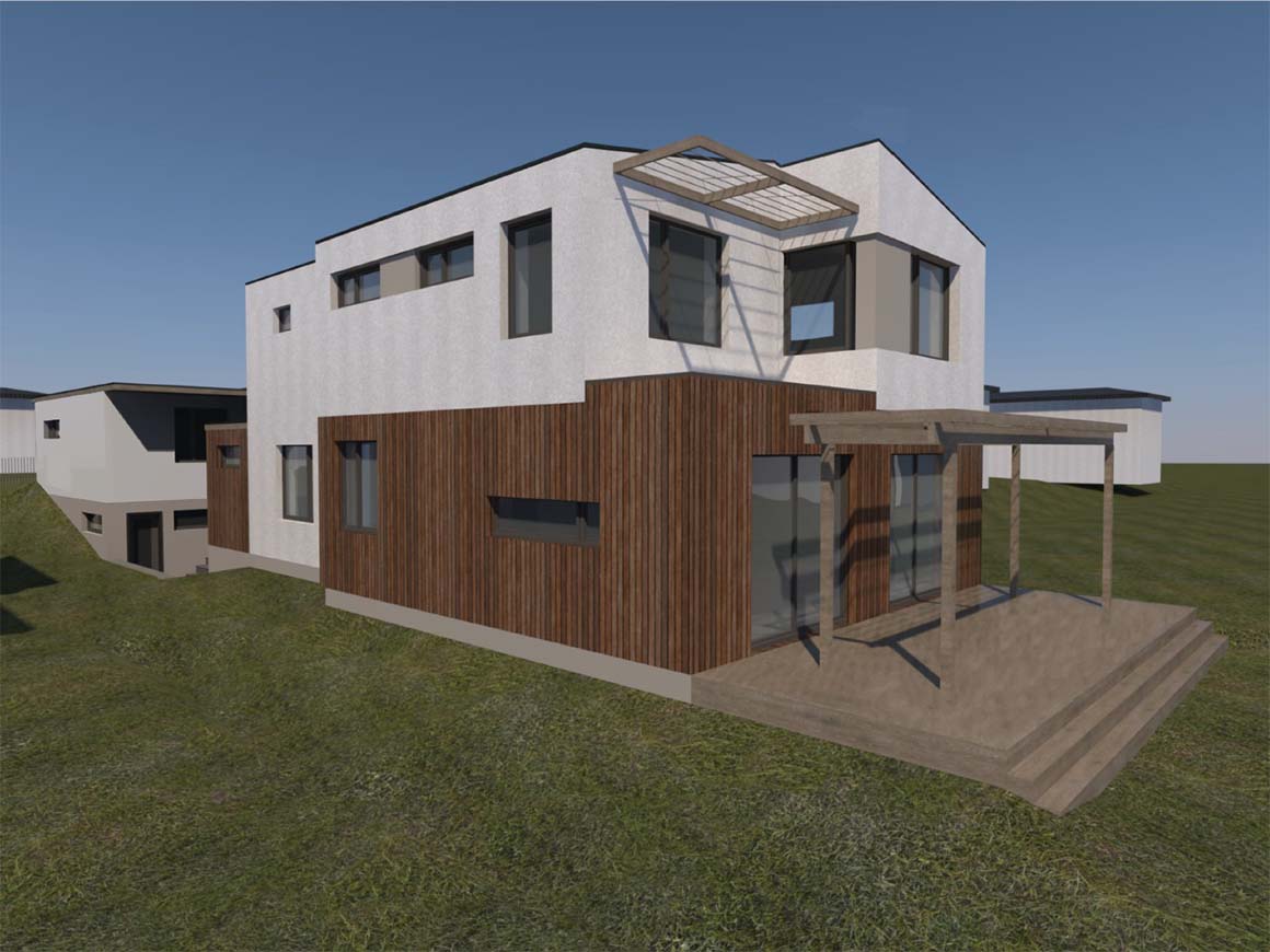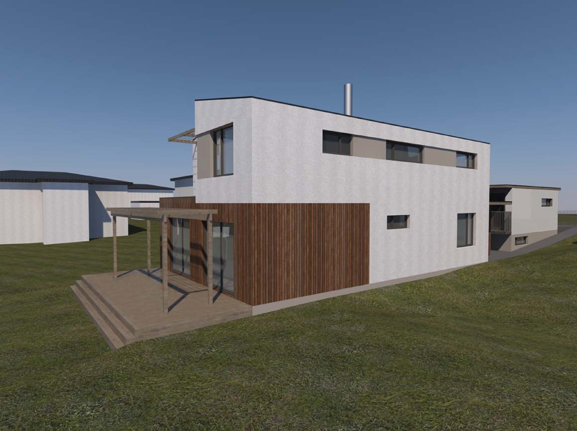 Jedná se o rodinný dům o dvou nadzemních podlažích (1+P). Samotný rodinný dům se základním tvarem jednoduchého kvádru s rozšířeným rizalitem kuchyně v 1.np a pokoje ve 2.np bude o vnějších rozměrech 16,12 x 7,97 m. Tato základní hmota je doplněna o konstrukce slunolamu a přesahů střechy pro dosažení výsledného architektonického ztvárnění a efektivního návrhu. Dům o větší dispoziční velikosti, umožňující i úpravu na dvougenerační bydlení.