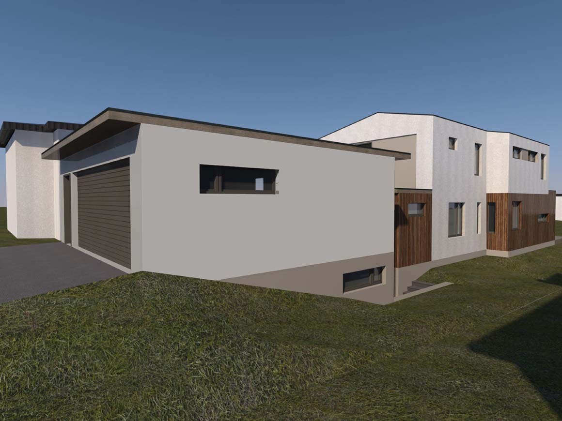 Obvodové stěny objektu budou zateplené zvenčí a omítnuty. Tvar střechy bude s mírným sklonem – sedlová střecha, která se více hodí do okolního prostředí. K objektu bude přistavěna garáž pro automobily. V suterénu garáže bude umístěna dílna.